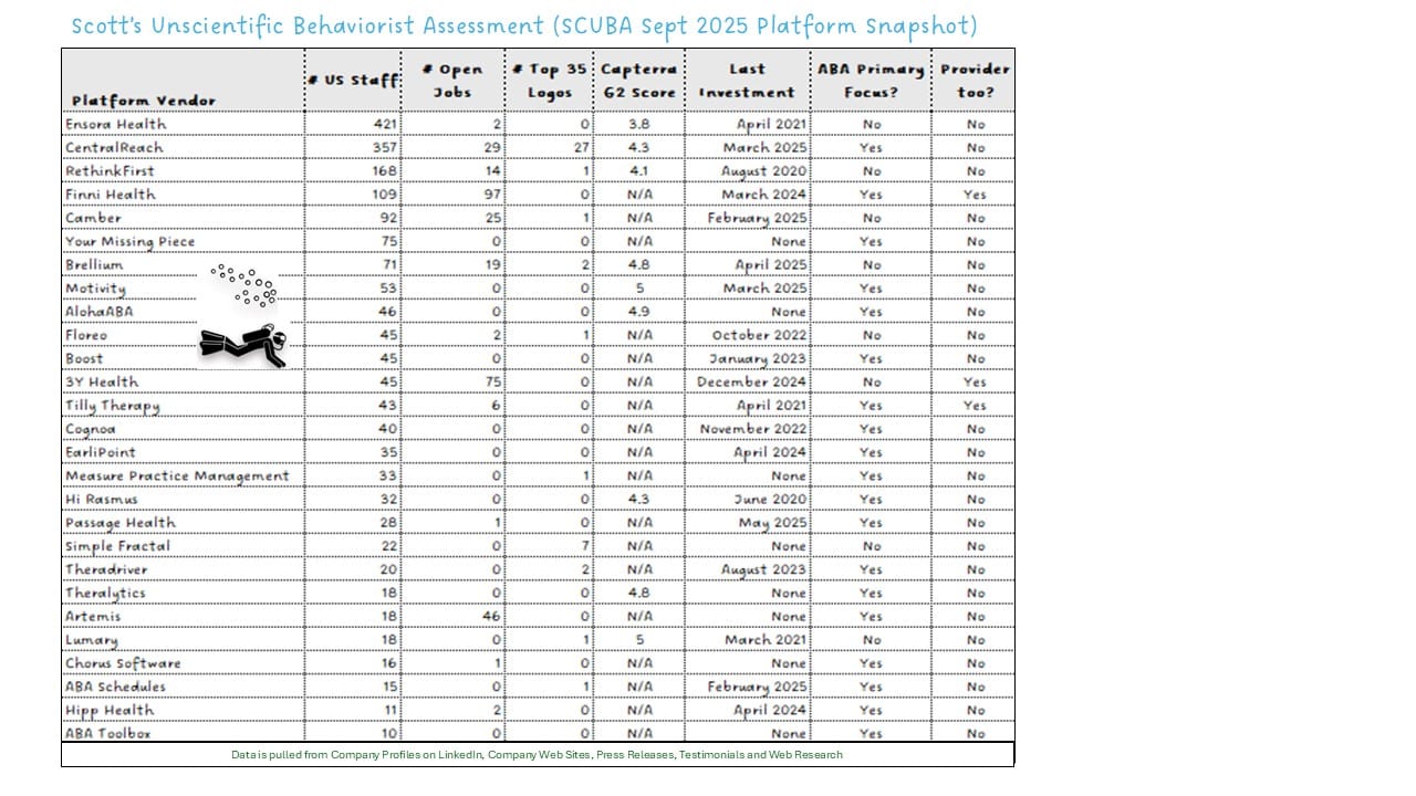 SCUBA stands for Scott’s Completely Unscientific Behaviorist Assessment — a lightly irreverent, yet informative lens on the evolving ABA platform landscape. This page provides background on the methodology, context for interpreting results, and links to all current and past monthly findings.